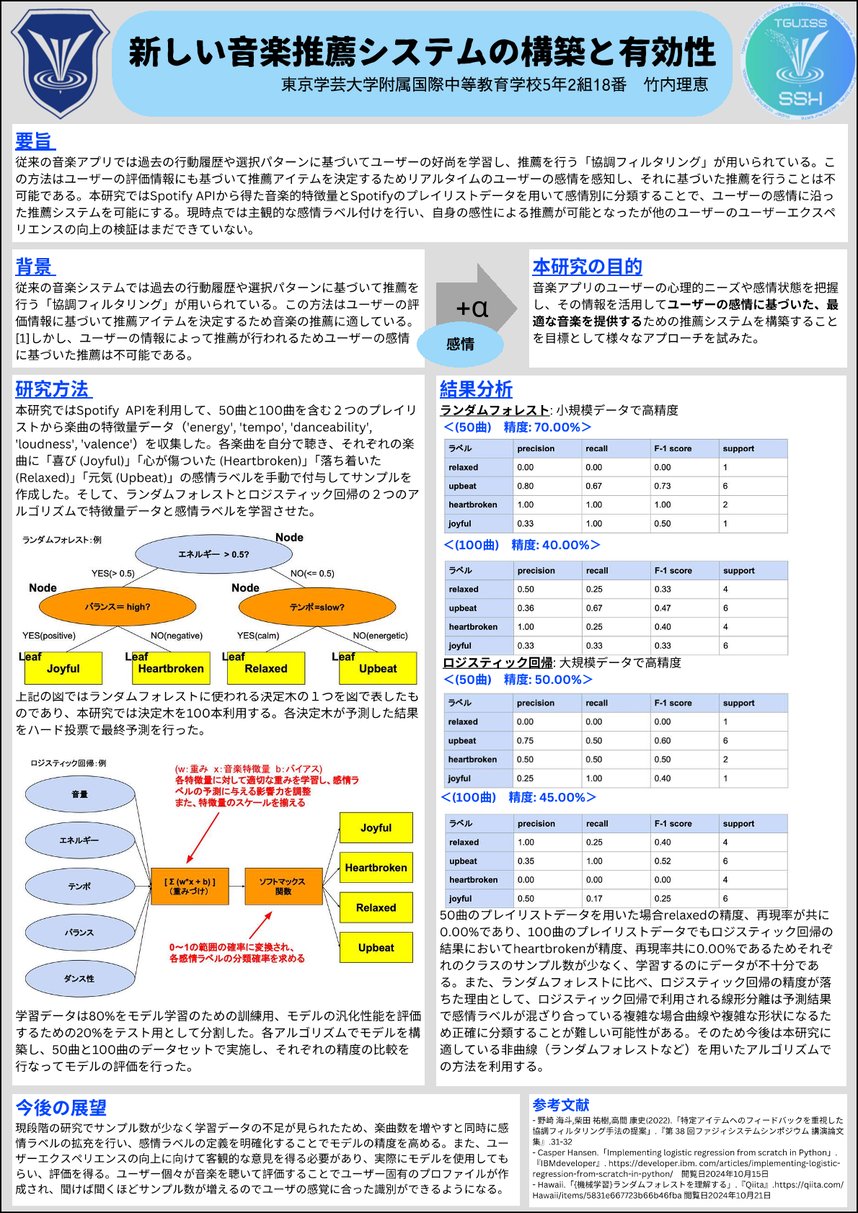 今の段階では、曲に対して抱く感情を自分自身でラベル付けをして推薦システムのモデルを構築したため、感情ベースの推薦システムに適している方法を見つけることはできましたが、主観的なシステムとなっています。今後は、よりたくさんのユーザーに適するシステムを作りたいと考えています。