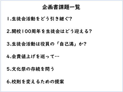 例えば、「文化祭の存続を問う」の「課題」は、近年文化祭にかける生徒の熱が徐々に低くなって盛り上がっておらず、また意思決定や企画の実行では文化祭実行委員(→実行委員長以外は3年生が中心)の専横が見られることから、学校側から「授業をつぶしてまで文化祭を実行する教育的価値を認められないので、抜本的な改革を行わない限り、3年後から文化祭の開催を認めない」との通達があった。文化祭存続のために、どのような改革を提案したらよいか、といったものです。