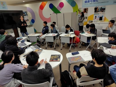 中高生が、恐竜をきっかけに、自然科学の面白さを知ることができるような教育プログラムを作る活動もしている。(河合塾にも協力いただき、様々な中学・高校に出向いて、授業を行っている。写真はドルトン東京学園の「探究ラボ」より)